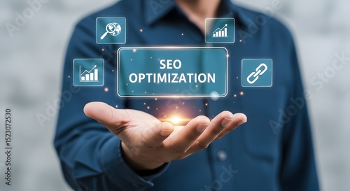 Man's hand displays SEO optimization concept featuring keywords, search engine, and link building for improved online presence and higher rankings.