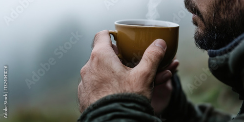 Man's Hand Holding a Yellow Mug of Hot Beverage