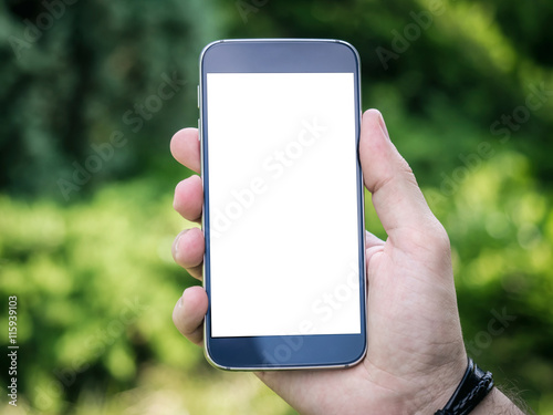 Man's hand holding mobile smartphone with white blank screen