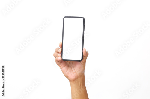 Man's hand holding the black smartphone with blank screen and modern frameless design. Isolated on white background.