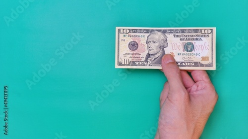 Man's hand is making a payment. Business Investment Economy Money Loan Saving Income and Finance concept. Male hand showing dollar bills on green background. Ten Dollar. 10 USD. Prosperity concept.