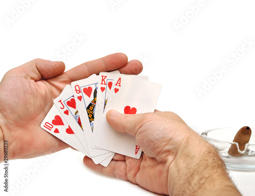 Man's hand lifting up playing cards