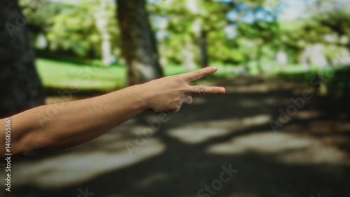 Man's hand making peace sign in lush green park, sunlit garden backdrop creating serene outdoor environment with blurred trees and soft natural light.