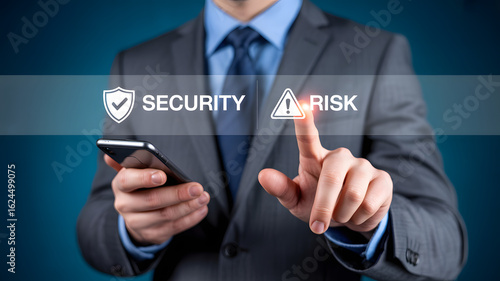 Man's hand touching screen with security and risk options, symbolizing business choices.