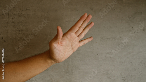 Man's hand with fingers spread against a concrete background