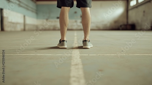 Man's legs and shoes standing on a worn indoor court.