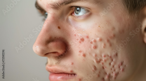 Man's profile with severe acne on skin.