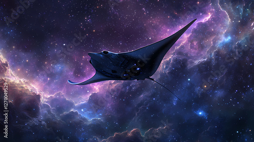 Manta ray gliding across a cosmic starfield dwarfed by a massive nebula. Underwater Starfields. Illustration