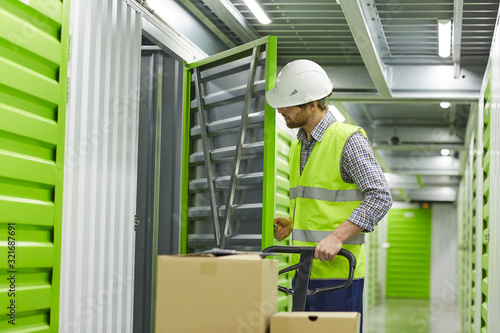 Manual worker in protective workwear standing with cart and loading boxes in storage room