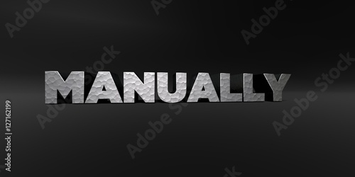 MANUALLY - hammered metal finish text on black studio - 3D rendered royalty free stock photo. This image can be used for an online website banner ad or a print postcard.