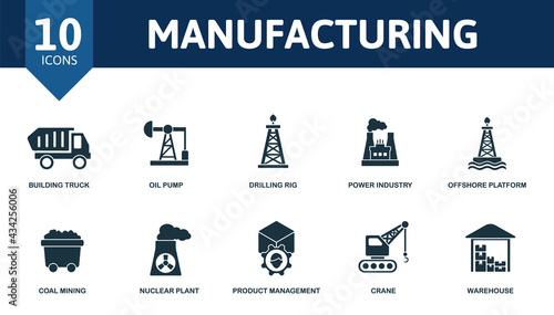 Manufacturing icon set. Contains editable icons industrial theme such as building truck, drilling rig, offshore platform and more.