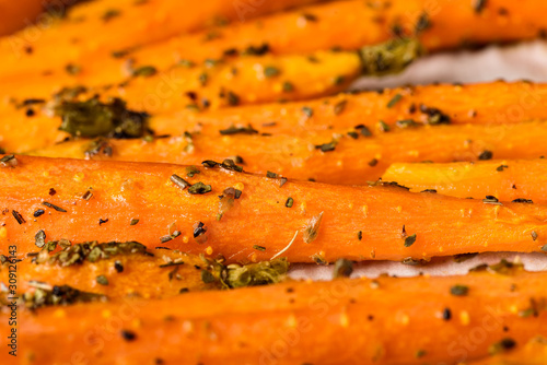 Many baby carrots are covered with herbs ready for roasting on a roasting dish