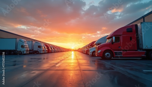 Many big trucks with trailers stand parked in rows on logistics warehouse lot. Orange sunset sky reflects on wet pavement. Cargo vehicles wait for transport work, showing modern delivery, shipping