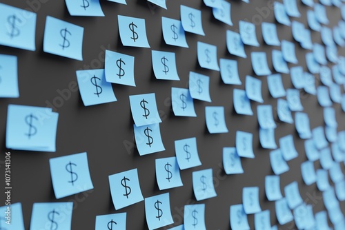 Many blue stickers on black board background with symbol of East Caribbean dollar drawn on them. Closeup view with narrow depth of field and selective focus. 3d render, illustration