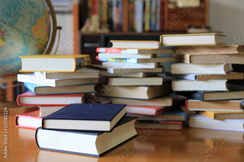 Many books are stacked on the table in the library. Stacks of books in the background selective focus and shallow depth of field