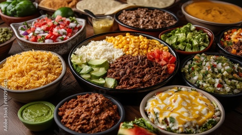Many bowls with fresh ingredients on a wood table are ready. It is suitable for a restaurant menu or a recipe blog post.