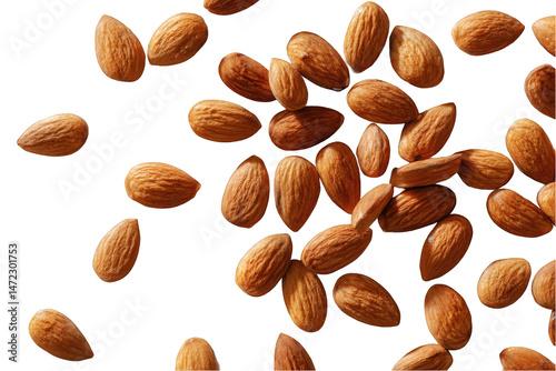Many brown almonds falling on delicious healthy food nuts snack ingredient recipe photography studio on transparent background