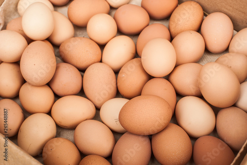 Many brown eggs in box. Chicken farm. Place for text. Preparation for Easter.