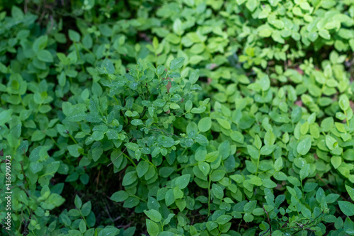 Many bushes of common blueberry Vaccinium myrtillus. Background of blueberry bushes