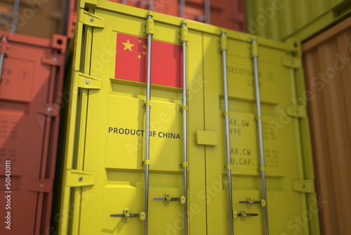 Many cargo container with products of China and printed national flag. Export or import related 3D rendering