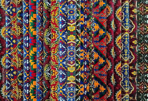 Many carpets of different colors, with different patterns stand vertically, for sale, for home, for advertising.