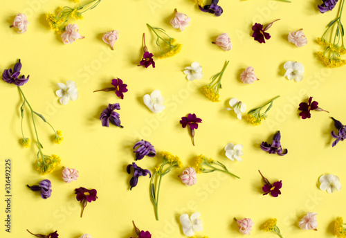 Many colorful flowers lie on a yellow background. Hyacinths and wildflowers. Floral background.