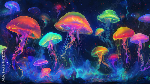 Many colorful jellyfish swimming in a spacelike ocean depths