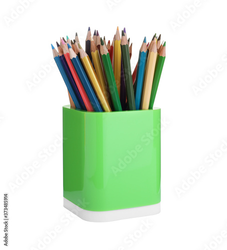 Many colorful pencils in green holder isolated on white. School stationery
