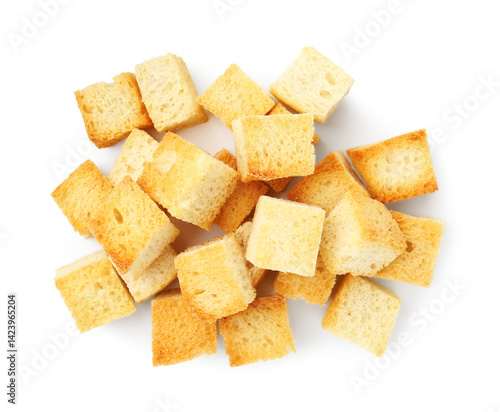 Many delicious crispy croutons isolated on white, top view