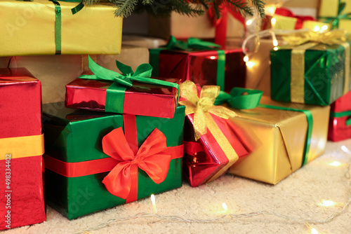 Many different gift boxes and festive lights on carpet, closeup. Christmas celebration