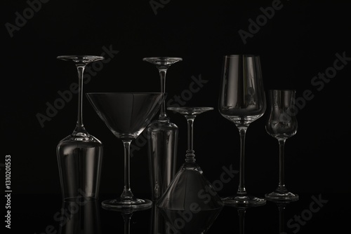 Many empty clean glasses on black background