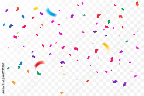 Many falling colorful confetti isolated on transparent background. Celebration banner. Vector