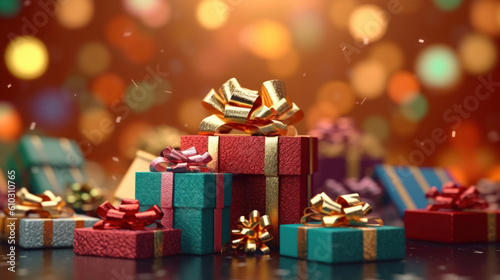 Many gift boxes, tied velvet ribbons an blurred background.
