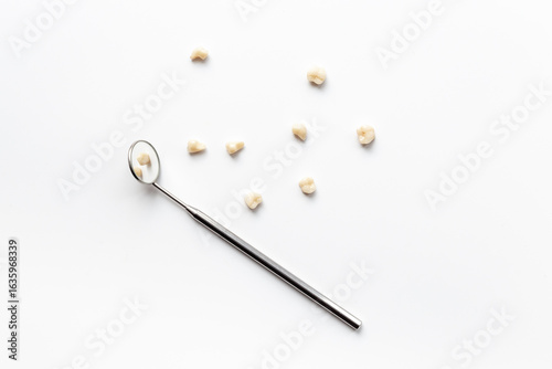 Many human teeth crown for dental implantation with dental mirror on white background. Professional Dentist tools, top view