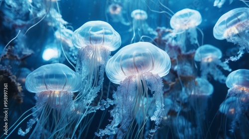 Many light blue jellyfishes in deep dark blue water. Neural network ai generated art
