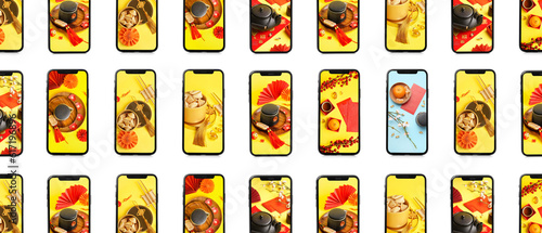 Many mobile phones with Chinese wallpapers on screens against white background. Pattern for design