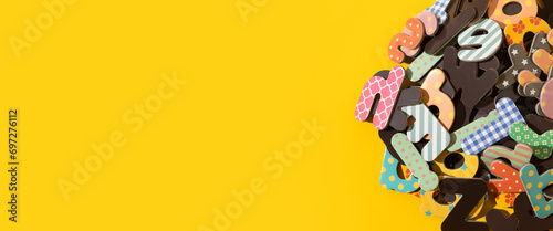 Many multi-colored letters of the alphabet abc on a yellow background. Top view, flat lay. Banner