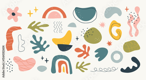 Many organic shapes and abstract elements scattered on a cream background create a playful modern art arrangement