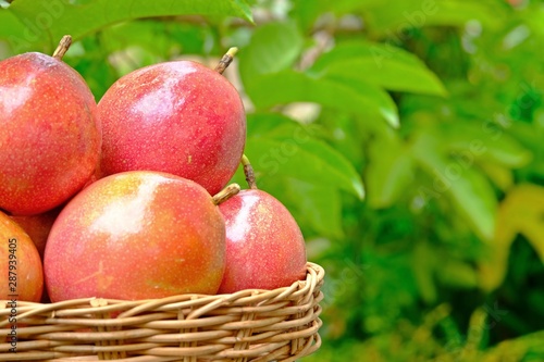 Many passion fruits in bamboo basket with green leaves as background.