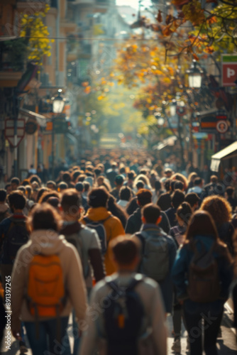 Many people walking on the street in an urban city center, with buildings and trees visible in blurred focus, with the diverse crowd in age and gender dressed in various styles.