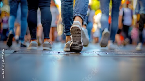 Many people were walking on the street. The background was blurred with a focus on the busy city streets. People were moving along the sidewalk