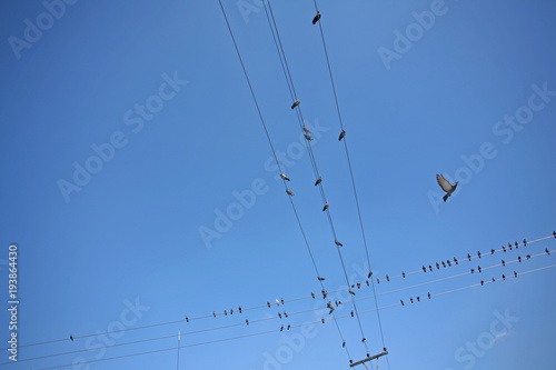 Many pigeons and birds perch on telephone wires on a clear day in Mandalay