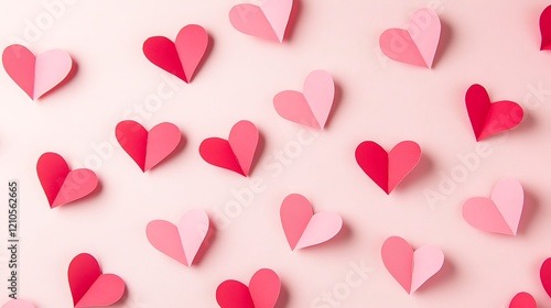 Many pink and red paper hearts are scattered across a light pink background, creating a romantic and festive scene.
