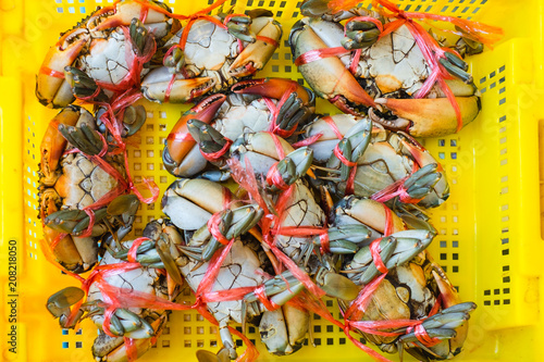Many raw serrated mud crab tied with red rope in yellow basket for cooking seafood.