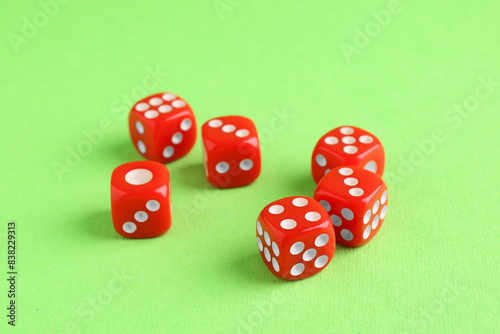 Many red game dices on green background
