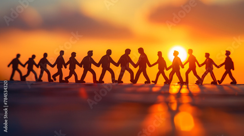 many silhouettes of human figures walking in a line to meet each other holding hands against the background of the sunset