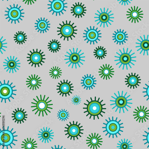 Many small green blue flowers on gray background. Seamless pattern with daisies. Flower with many petals. Design in retro style for girls. Vector illustration for paper, textile, cards.
