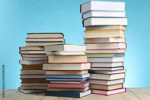 Many stacked books on wooden table against light blue background