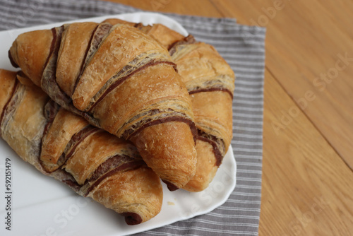 Many sweet croissants with chcolate on a white ceramic tray on wooden table