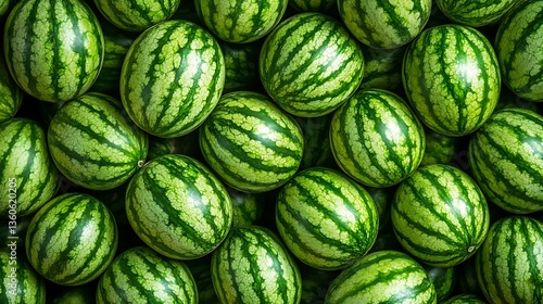 Many watermelons clustered together with green and striped patterns